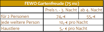Im Haus Herrenstraße 10 befinden sich zwei Ferienwohnungen. Wohnung Gartenfreude befindet sich im Obergeschoss. Sie verfügt über einen eigenen Eingang in der Weingartenstr.75 und ist durch Omas Garten zu erreichen. von der großen Süd-Terrasse genießen Sie einen wunderschönen Ausblick über die Weinberge bis hinauf zum Wald. In der Wohnung befinden sich zwei Doppelschlafzimmer (eins mit Waschgelegenheit), Radiowecker, auf Wunsch Beistellbett. Der Wohnraum ist mit einer kompletten Küchenzeile (Backofen, 4- Plattenherd, Mikrowelle, Kühlschrank mit Gefrierfach, Toaster, Kaffeemaschine, Wasserkocher), einer Ess- und Wohnecke mit neuem Flatscreen und Radio ausgestattet. Das Bad ist mit Dusche und WC, sowie zusätzlich ein separates WC. Sonstiges: eigener Parkplatz, Fahrradgarage, Brötchenservice, WLAN, Babyausstattung (Hochstuhl und Kinderbett) auf Anfrage, Gästeticket (für freie Fahrt mit Bus und Bahn in der Region. Damit sind sie flexibel unterwegs. Machen Sie „Urlaub vom Auto“).